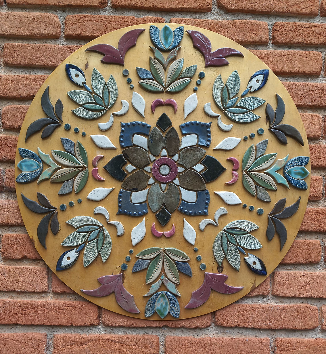 Mandala de cerâmica artesanal em madeira, com 60 cm de diâmetro, ideal para decoração de interiores que valorizam exclusividade e arte manual.