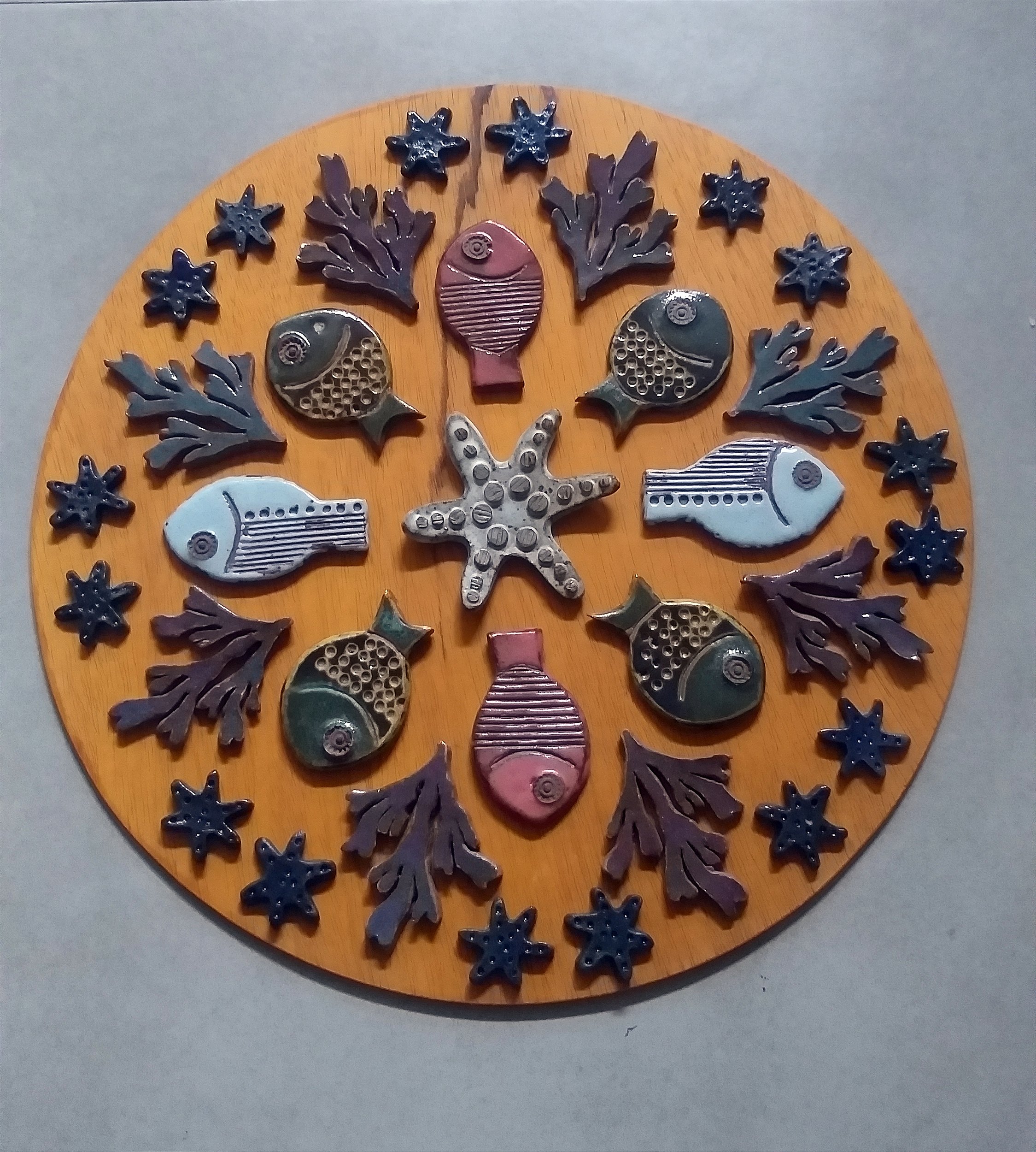Mandala em cerâmica artesanal de alta temperatura sobre madeira 4mm diametro 45 cms