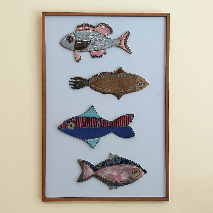 Painel 4 peixes em cerâmica artesanal sobre madeira 42 X 62 cms
